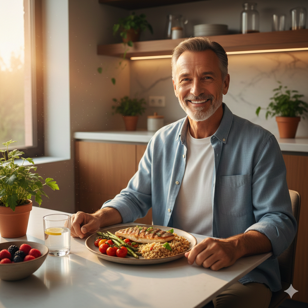 Правильное питание после 50 — это не диета, а образ жизни. Белок, овощи, сложные углеводы, вода, умеренность в соли и сахаре. Ничего сложного, но системность решает всё. Я прошёл этот путь от 141 до 105 кг и теперь знаю: сбалансированное питание даёт не только стройность, но и энергию, здоровье и хорошее самочувствие.